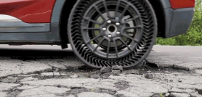 不過好消息是,以后咱們可能再也不會見到這樣的悲劇。在不久前開展的 Movin'On 峰會上,知名輪胎大廠——米其林就宣布了”免充氣輪胎“即將量產(chǎn)的消息。而這款革命性的輪胎就叫做 Uptis Prototype。