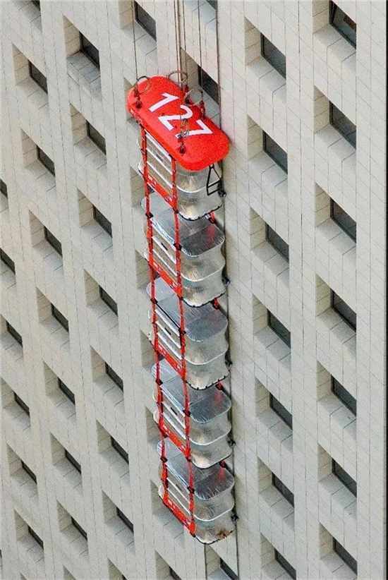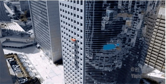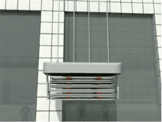 以色列一家公司發(fā)明了一個逃生折疊電梯,一旦遇到火災可以幫助高樓層住戶淡定逃生。從高處直接坐著這個電梯,沿著大樓墻壁降下來。
