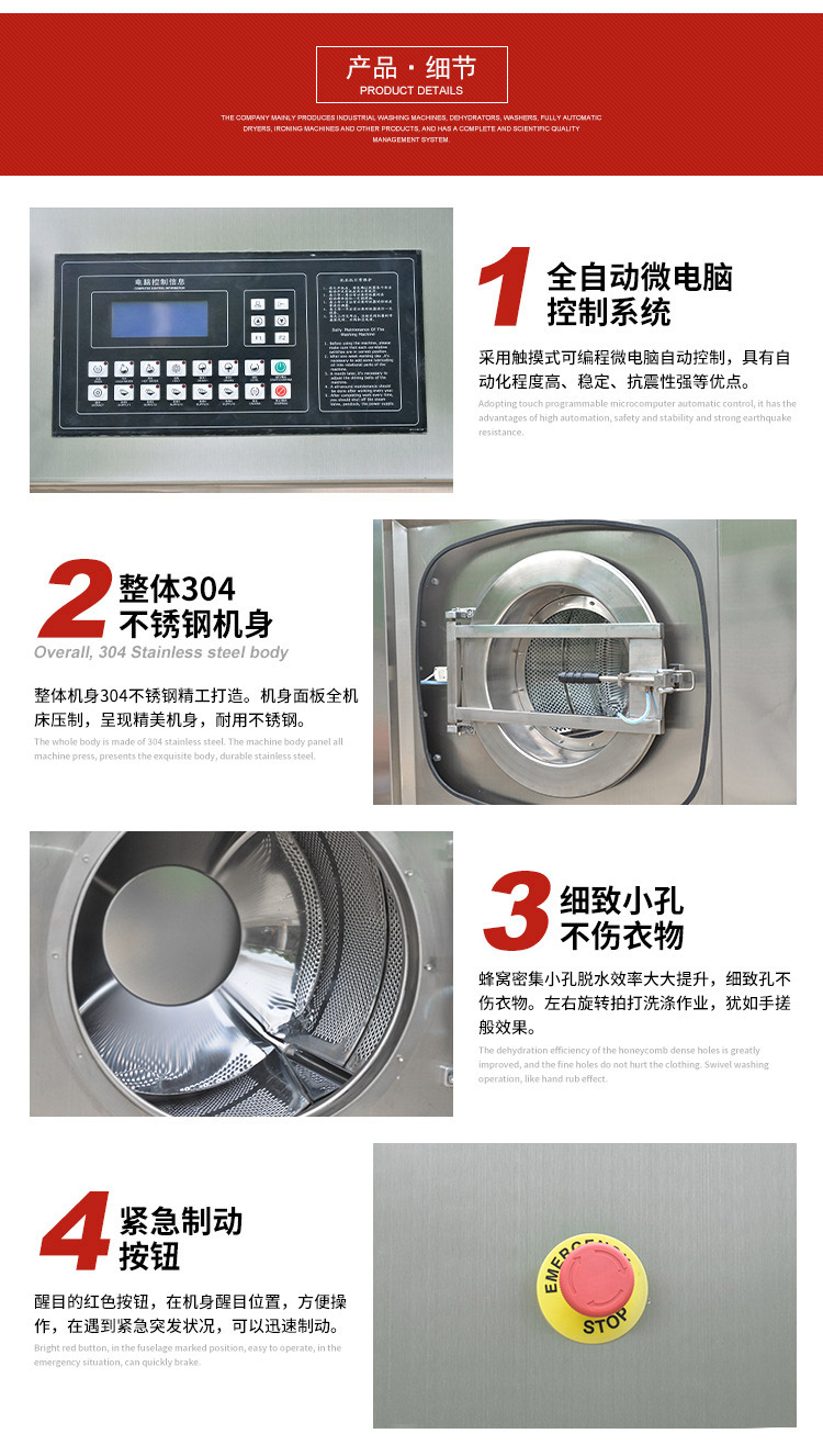 不銹鋼外缸、防腐蝕;內(nèi)膽采用不銹鋼材料焊接而成;門圈采用流行的圓口對接式,防止洗滌時損傷衣物。