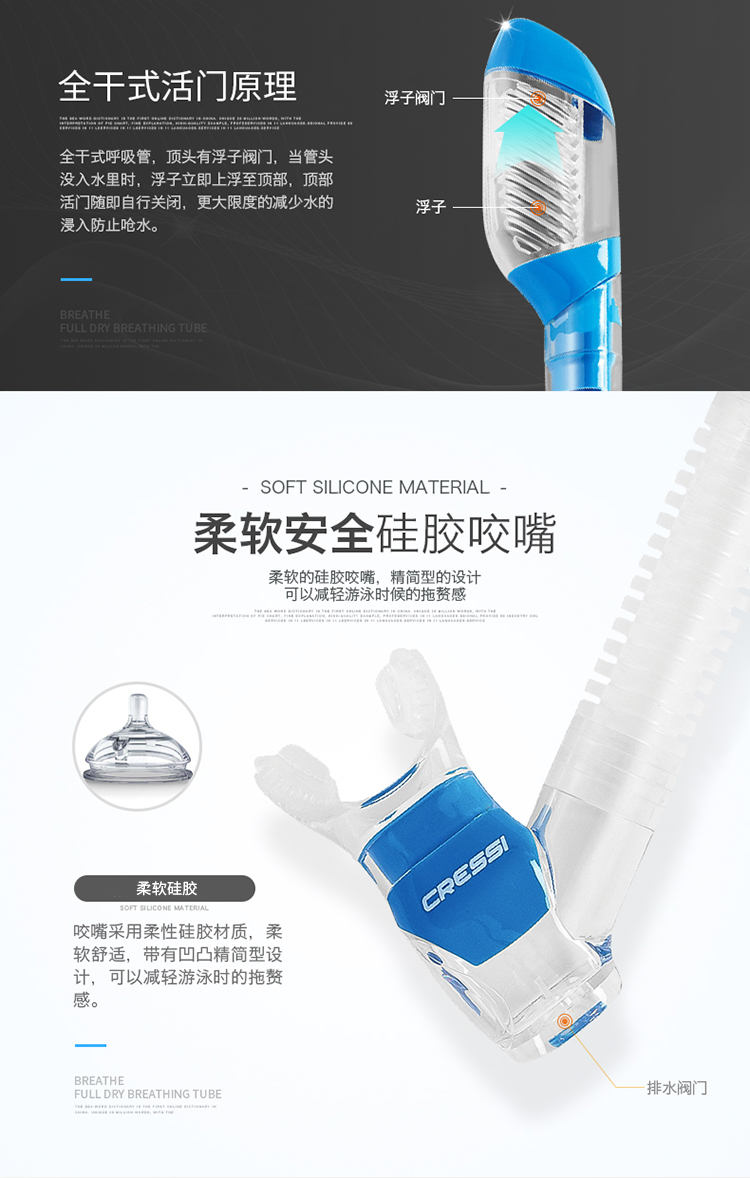 2、干式管和濕式管(包含半干式管):干式管可確保下潛時不會有水灌進(jìn)管中,而濕式管則保證不了。閉氣下潛后上浮到水面時,濕式管需要鼓足氣一下將灌滿管中的水從進(jìn)氣管頭和排水閥處吹走,然后才吸氣呼吸。